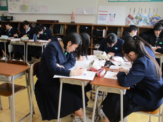 2月19日(木) 3年生「授業の様子」 公開日 2026/02/20 更新日 2026/02/19 3年生 3年生の授業では、それぞれが真剣に課題に取り組んでいます。(写真 上:1組 社会、中:2組 英語、下:3組 音楽)