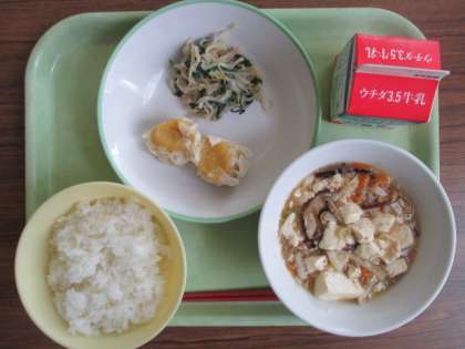 献立は、ごはん、牛乳、マーボー豆腐、にんじんシューマイ、塩ナムル でした。