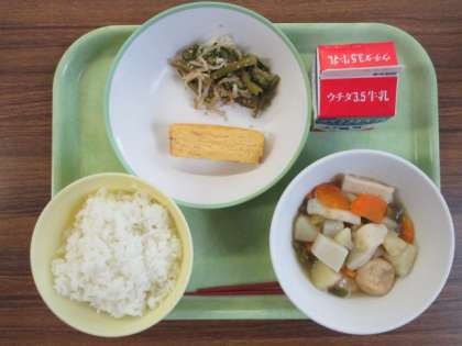 献立は、ごはん、牛乳、厚焼き卵、茎わかめのごま酢和え、関東だき でした。