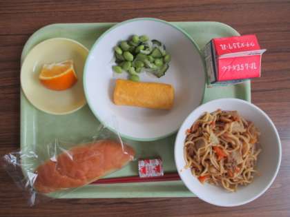 献立は、コッペパン、牛乳、焼きそば、卵ロール、枝豆のマリネ、甘夏みかん、ポケットチーズ でした。
