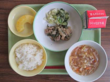 献立は、ごはん、牛乳、豚肉のおろし炒め、きざみ和え、春雨スープ、カットパイン でした。