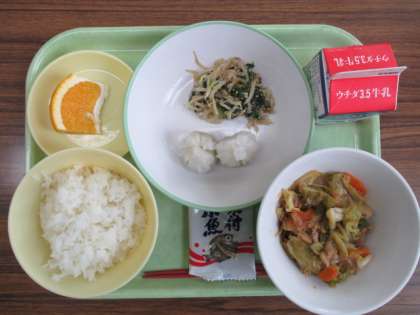 献立は、ごはん、牛乳、回鍋肉、えび包子、こまつなのごま和え、サンフルーツ、味付け小魚 でした。