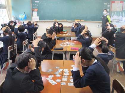 4月28日(水)1年授業の様子 公開日 2021/04/28 更新日 2021/04/28 学校生活 画像上:1組美術 美しい場所見つけ 画像中:2組英語 アルファベットカードゲーム 画像下:3組数学 数の大小比べ