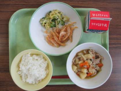 献立は、ごはん、牛乳、肉じゃが、白えびの米粉揚げ、あわせ和え でした。