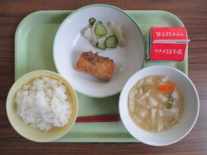 献立は、ごはん、牛乳、揚げ出し豆腐のごまだれかけ、かぶのレモン和え、つみれ汁 です。