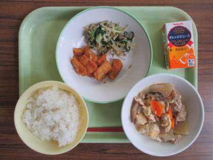 献立は、ごはん、オレンジジュース、豚肉と大根のごまみそ煮、いかのかりん揚げ、もやしのおひたし でした。