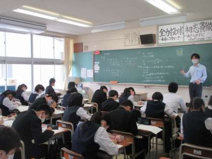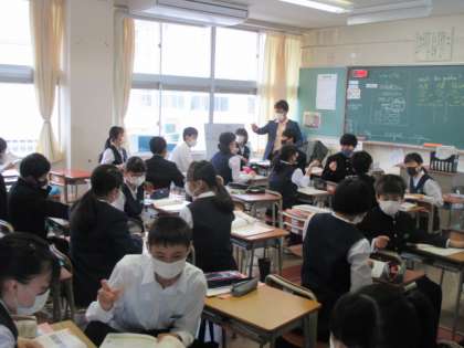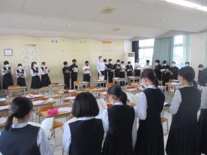 画像上:1組英語 苦情や謝罪の表現 画像中:2組音楽 フーガ ト短調 画像下:3組数学 等式の変形