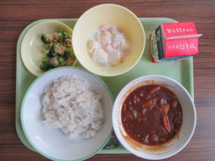 献立は、麦ごはん、牛乳、たべキリンハヤシ、豆豆サラダ、フルーツヨーグルト でした。
