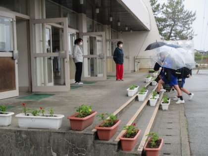 5月27日(木)登校時の様子 公開日 2021/05/27 更新日 2021/05/27 学校生活 小雨の中の登校となりました。今日は低めの気温になりそうです。体調管理をしていきましょう。 昨日植えた花々は、水分をもらい元気そうでした。