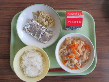 献立は、ごはん、牛乳、かしわうどん、さばの銀紙焼き、甘酢和え でした。