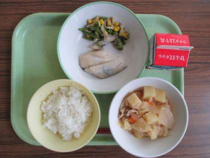 献立は、ごはん、牛乳、鰆の塩焼き、アスパラソテー、じゃがいもと豚肉のみそ煮込み でした。