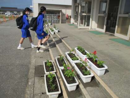 6月1日(火)登校時の様子 公開日 2021/06/01 更新日 2021/06/01 学校生活 今日から6月。今日は運動会の練習最終日、そして当日の会場設営になります。運動会へのムードが高まっている中、生徒玄関の水をたっぷりもらった花々が癒やしの時間を提供してくれます。