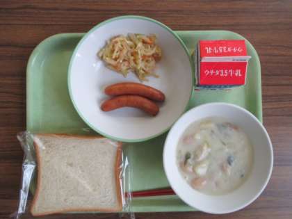 献立は、食パン、牛乳、ウインナー、おろしポン酢サラダ、豆乳シチュー でした。