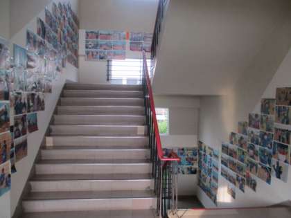 今日の運動会に向けて、生徒のはじける笑顔や真剣に取り組む姿が壁いっぱいに掲示されています。