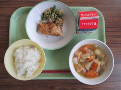 献立は、ごはん、牛乳、魚の南蛮づけ、いり大豆和え、関東だき です。