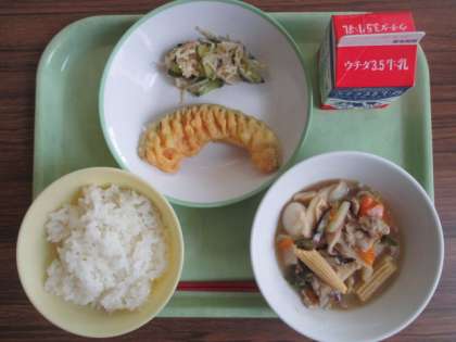 献立は、ごはん、牛乳、八宝菜、かぼちゃ天ぷら、甘酢あえ でした。