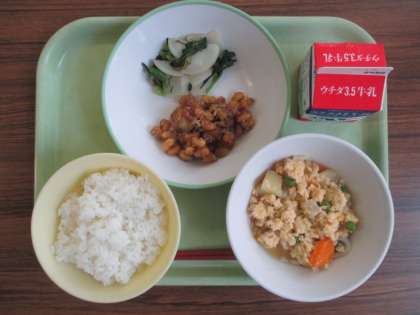 献立は、ごはん、牛乳、大豆とホタテのごまからめ、昆布和え、卵とじ でした。