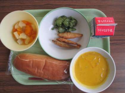 6月15日(火)今日の給食 公開日 2021/06/15 更新日 2021/06/15 学校生活 献立は、コッペパン、牛乳、わかさぎのフリッター、グリーンサラダ、かぼちゃポタージュ、フルーツゼリーミックス でした。