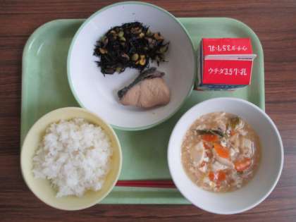献立は、ごはん、牛乳、ふくらぎの西京焼き、ひじきのソテー、豆腐の野菜あんかけ でした。