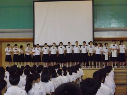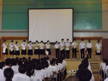 7月21日(水)受賞伝達式 2 公開日 2021/07/21 更新日 2021/07/21 学校生活 市民体育大会と県選手権大会の受賞伝達式の様子です。 上が体操部とバドミントン部男子、バドミントン部女子です。 下がバレーボール部です。