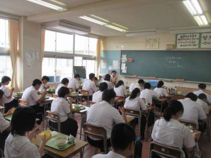 9月1日(水)3年 給食時の様子 公開日 2021/09/01 更新日 2021/09/01 学校生活 2学期の給食が始まり3日目。給食の準備も素早く行い、前を見て会話をせずに食べていました。校内放送では、給食メニューの紹介や生徒会からの連絡、そして音楽が流れていました。 今日から教育実習生も準備を見届け、一緒に給食を食べていました。