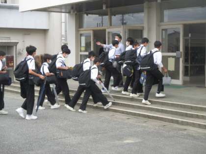 9月17日(金)登校時の様子 公開日 2021/09/17 更新日 2021/09/17 学校生活 今日はいつもより手荷物が多かったようです。傘そして弁当があったので。この後、台風の影響がありそうです。十分注意しましょう。
