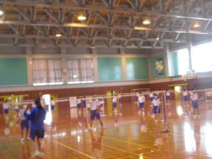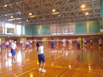 体育館でバドミントンをしていました。ラケットとシャトルに慣れようと真剣に取り組んでいました。