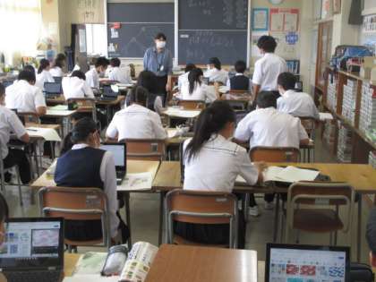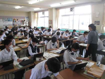 3組:美術 富山もようでの制作をしようとクロムブックで調べたりしながら準備を進めていました。