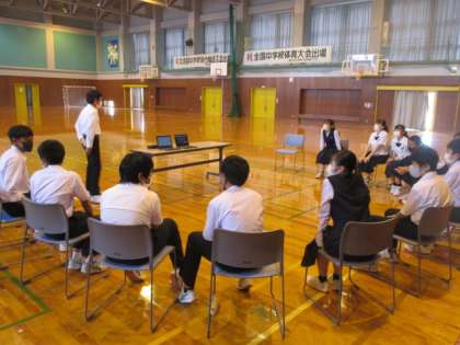 9月29日(水)学校レクリエーションの様子 1 公開日 2021/09/29 更新日 2021/09/29 学校生活 全校で学年の枠を超えて、クロムブックを使用しながら、交流を深めました。 全校生徒を20班に分け、生徒会執行部が出題する課題を各班の3年生を中心にクロムブックを使い答えました。課題の内容は、各教科の学習内容やニュース、本校や先生方に関する問題もあり、悩んだり笑ったりしながら答えていました。 画像上から、放送室(本部)、体育館、木工金工室