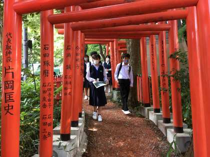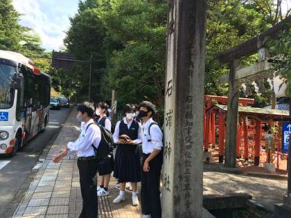 石川県立美術館の帰り道、石浦神社に立ち寄りました。班員、全員元気です。