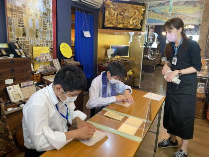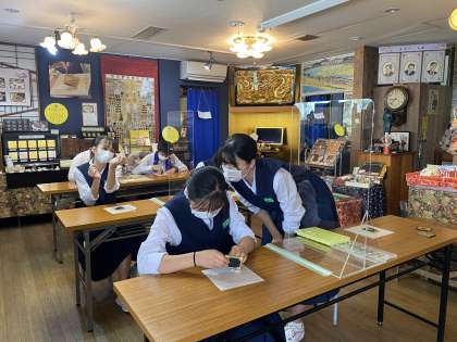 2年 校外学習 公開日 2021/10/08 更新日 2021/10/08 2年生 午後からはまた体験に向かい、金箔工芸田じまさんでコンパクトミラー、小判の金箔貼りをしています。自分でデザインして、世界にひとつの作品を作っています!