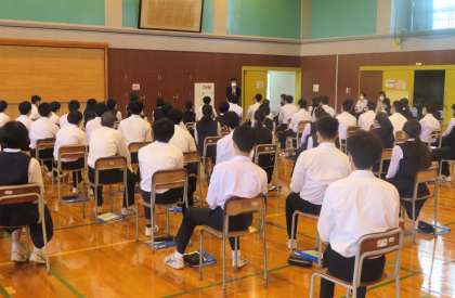 校長先生のお話(写真:上),引率の先生方へよろしくお願いしますの挨拶(写真:下)