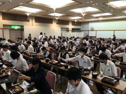 午前中の活動が終わり、昼食です。おかわりに列ができるくらい食欲があります。コスモスを観賞した後の食事は最高。食欲の秋!