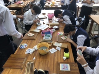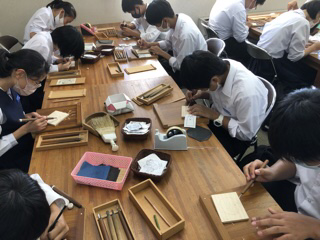 クラス別体験学習、1組は創遊館で木彫り体験。説明を聞いた後、自分の作品制作に集中していました。