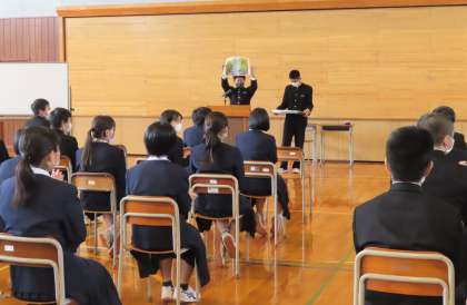 11月1日(月)3年 学年集会 公開日 2021/11/01 更新日 2021/11/01 3年生 学年集会の最初に「修学旅行フォトコンテスト」の表彰式を行いました。「風景部門」「人物部門」の2部門で、優秀賞、努力賞の表彰をしました!!