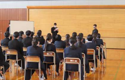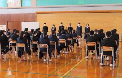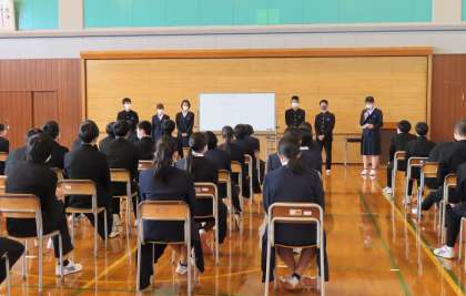 11月1日(月)3年 学年集会 その2 公開日 2021/11/01 更新日 2021/11/01 3年生 後期3学年生徒会では、「15歳の常識」(普段の学校生活の基本的なルールを示したもの)を提案しました。卒業に向けての半年間、基本を大切にし、堂々と和合中学校を卒業していきたいという思いからこの取組が始まりました。分かりやすい合い言葉も提示されたので、みんなで意識していきましょう!!