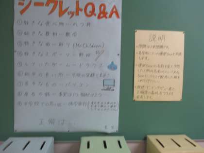 11月5日(金)生徒会活動 公開日 2021/11/05 更新日 2021/11/05 学校生活 中館の掲示板に「シークレット Q&A」と書かれた掲示物が貼られていました。広報委員会の企画で、生徒又は職員に質問し、誰に質問したのかを答えるものです。今回は職員編でした。
