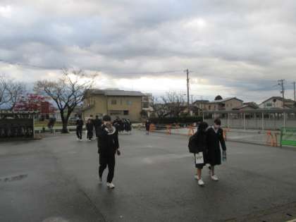 11月25日(木)登校時の様子 公開日 2021/11/25 更新日 2021/11/25 学校生活 時折、小雨が降る朝となりました。昨日の強風もあり、生徒玄関前の木々の葉がすっかり少なくなりました。 期末考査2日目、ワーク類を片手に登校する生徒もいました。