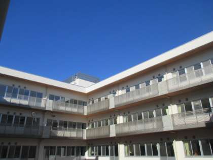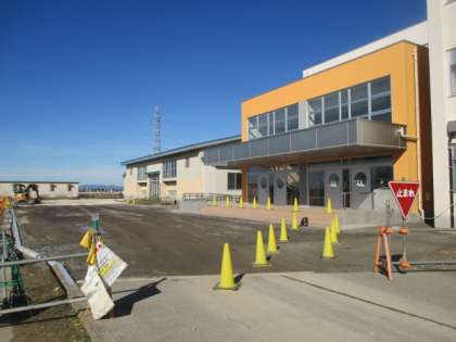 工事中周囲の舗装準備が進んでいました。そして、今日は青空に新校舎が映えていました。