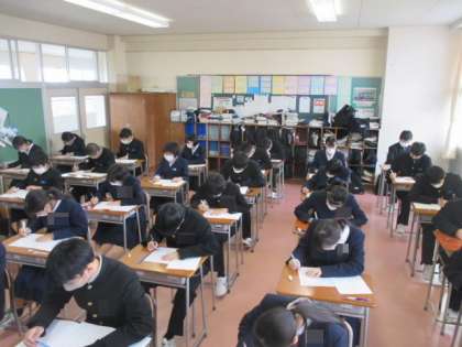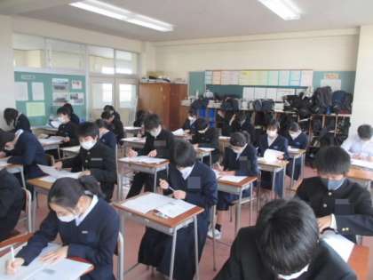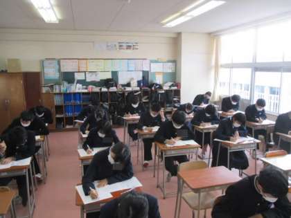 12月2日(木)3年 授業の様子 公開日 2021/12/02 更新日 2021/12/02 学校生活 中3学力調査1日目。社会、国語、理科のテストが行われました。5分前には着席し、合図があると、一斉に問題に取り組んでいました。
