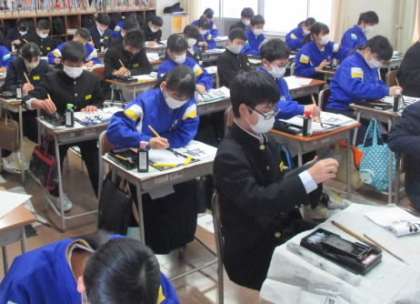 1年は「雄大な志」。先生の説明の後、一筆一筆丁寧に練習していました。
