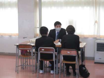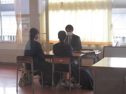 12月21日(火)保護者懇談会の様子 公開日 2021/12/21 更新日 2021/12/21 学校生活 懇談会の最終日。今日は前日までよりも暖かくなりました。3年生の教室では、2学期の反省に加え、進路について話し合っていました。