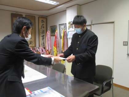 12月21日(火)ハンドボール全国大会激励 公開日 2021/12/21 更新日 2021/12/21 学校生活 第30回記念大会 JOCジュニアオリンピックカップハンドボール大会 に出場する生徒に和合地区教育文化後援会からの激励をしました。富山県代表の16名に選ばれ、徳島県で行われます。23日から予選リーグが始まります。がんばれ富山、がんばれ和合!