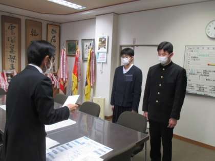 JOCカップ第35回全国都道府県対抗中学バレーボール大会と第14回全日本ユース(Uー15)水球競技選手権大会 に出場する生徒に和合地区教育文化後援会からの激励をしました。それぞれ富山県代表として参加し、26日から大会が行われます。
