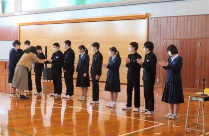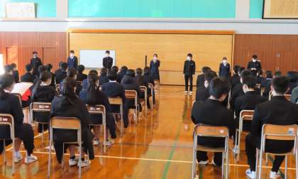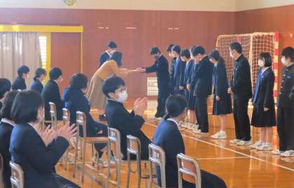 12月23日(木) 3年・学年集会!! その1 公開日 2021/12/23 更新日 2021/12/23 3年生 4限に学年集会を行いました。前半は学年MVPの表彰、学年生徒会からの振り返りがありました。振り返りの中には、「受検」「卒業」というワードが出てきました。力を蓄える冬にしましょう!!