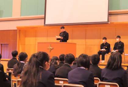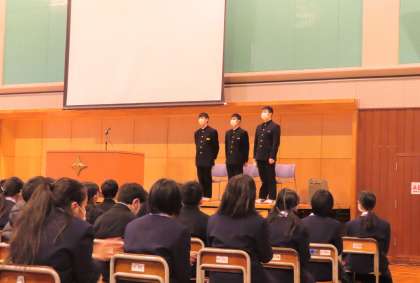 各学年の代表による、2学期を振り返っての意見発表がありました。学校生活、生徒会活動、学校行事…いろいろな場面で感じたこと、考えたことを堂々と話す姿はステキでした!!