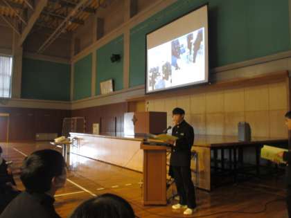 12月24日(金)生徒会からの連絡 公開日 2021/12/24 更新日 2021/12/24 学校生活 生徒会執行部から2学期の活動について報告がありました。活動の取組の様子やアンケート結果を丁寧に発表していました。