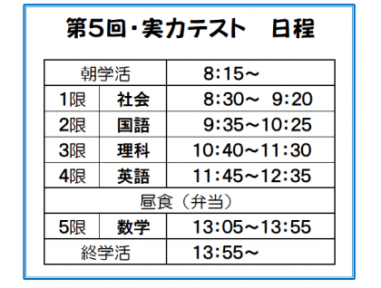 明日、1月5日(水)は第5回・実力テストです。冬休みの学習の成果を確かめる機会として、全力を尽くしましょう!!