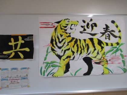 1月11日(火)生徒玄関の掲示板 公開日 2022/01/11 更新日 2022/01/11 学校生活 生徒玄関の掲示板には、「虎」のデザインと「共」のひと文字が掲示してあります。 「虎」:虎のように力強く、勇ましくあってほしいと願いが込められています。 「共」:始業式の式辞でもあったように、ひとりではない、共にがんばろうと寅年をイメージしてあります。