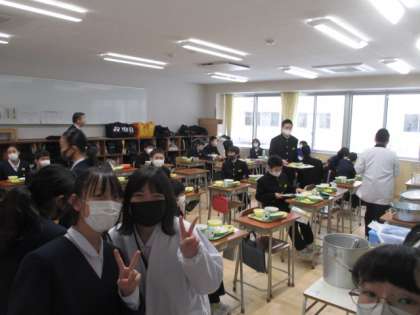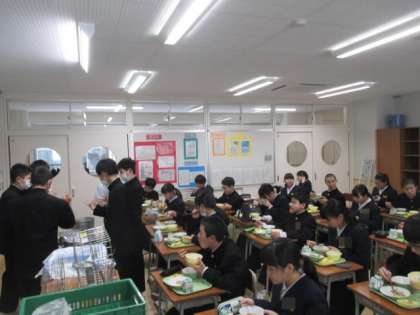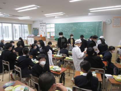 新しい教室での給食2日目、新しい配膳室や新しい配膳台に少し戸惑いながらも準備をしていました。